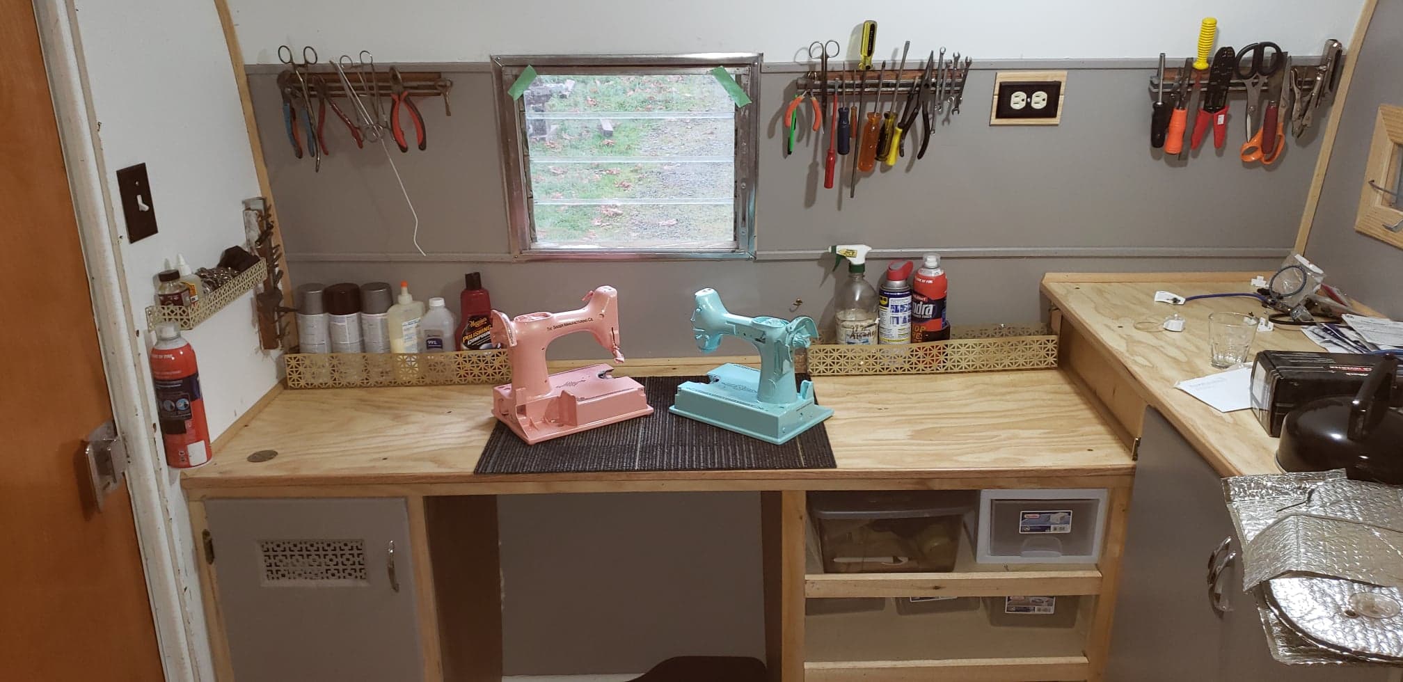 For away work, we've restored an old Shasta 16' trailer into a mobile mini-shop, which we take to the Soutwest during the Winter months.
