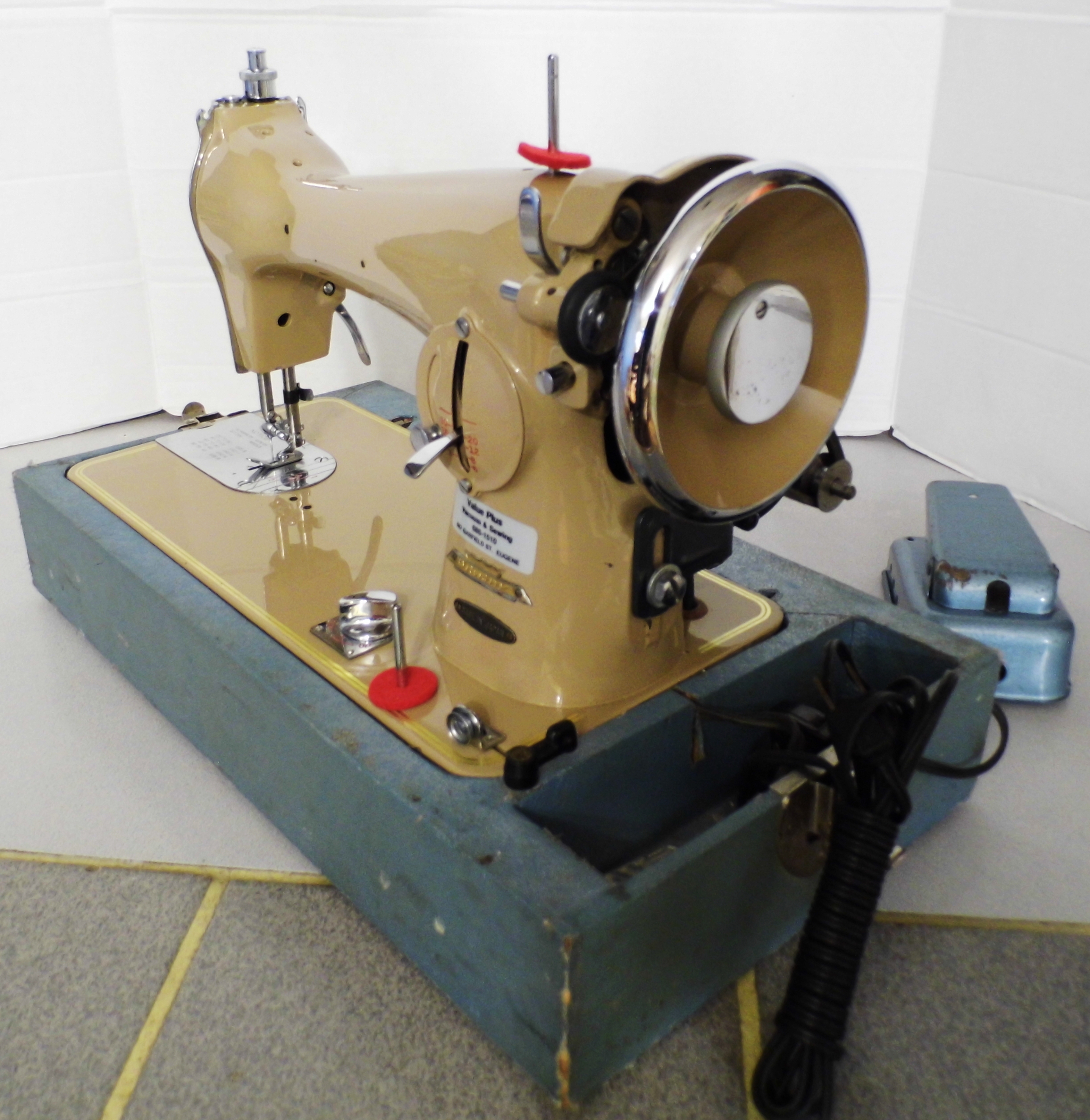 Patterned after Singer's fine class 15 machines, the Japanese manufacturers made it even better by adding an easy bed-mounted feed drop control, an instant-release sewing foot pressure control, and better paint in cool colors.