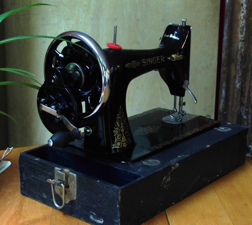 This is a real, working, heavy-duty sewing machine, identical to her big sister, the full-size Singer 66 (you may know that one as the Red Eye, the Sphinx, the Lotus, or by a different decorative design) in every way except for the size. This one will sew multiple layers of heavy material and even garment leather with ease. In fact, my friend sewed an entire tipi on her hand-crank Singer 99, and during testing, we sewed along the heavy seam on an old pair of Levis on this Singer 99 with no extra effort required.