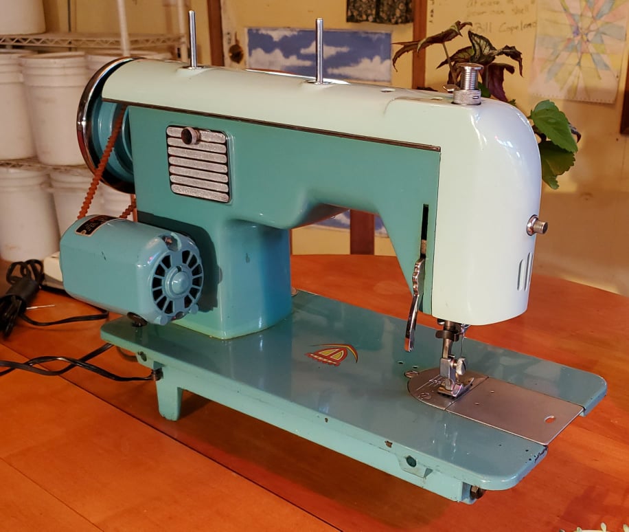 This SewMor 900 is fresh off our restoration bench, where we had her apart and scrubbed her parts in our alcohol bath to remove the decades of sticky, dried-on oil that bogs down a vintage sewing machine. After polishing, inspecting, and reassembling, she stands clean all the way through and her shiny clean parts are slipping, sliding, and whirling on a thin film of clean oil.
