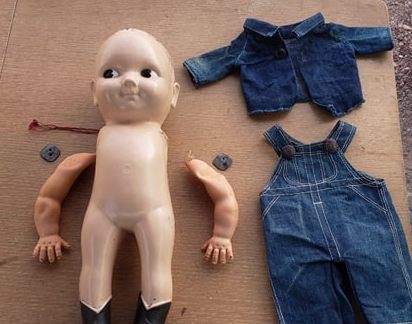 He comes with his shirt and overalls, though the shirt sleeve has some damage.